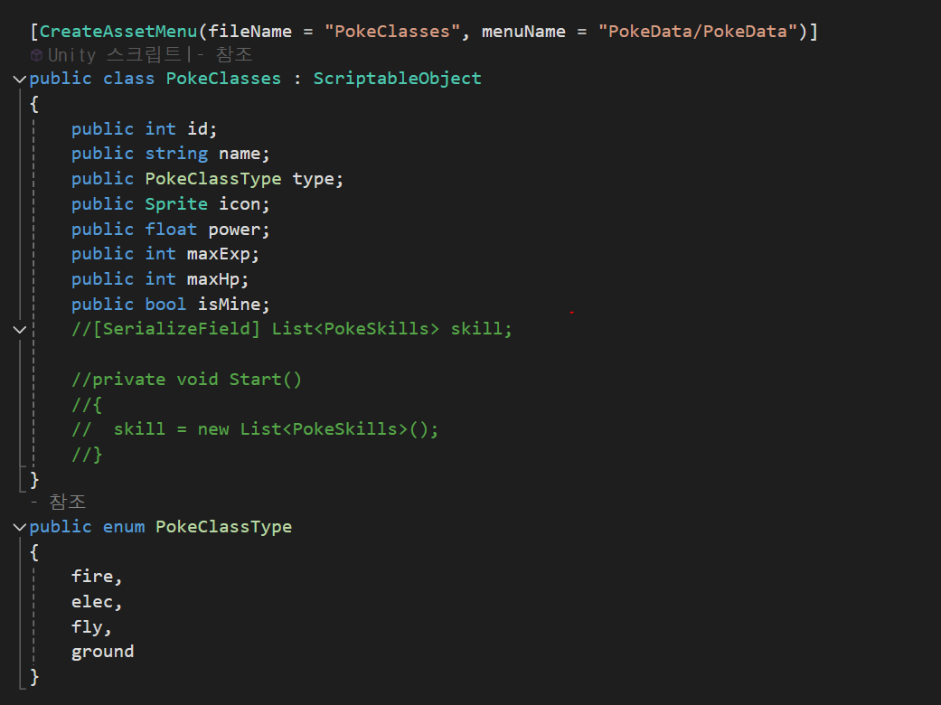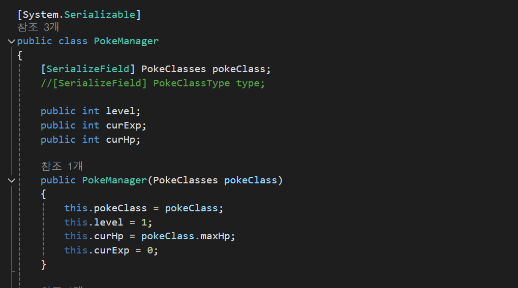 클래스를 직렬화해서 사용할것이기 때문에 Serializable을 사용하고, 클래스 내부에 스크립터블의 객체를 참조해서 생성 할 포켓몬 객체의 level, curExp, curHp변수를 PokeManager를 통해 설정 해줄것이다.