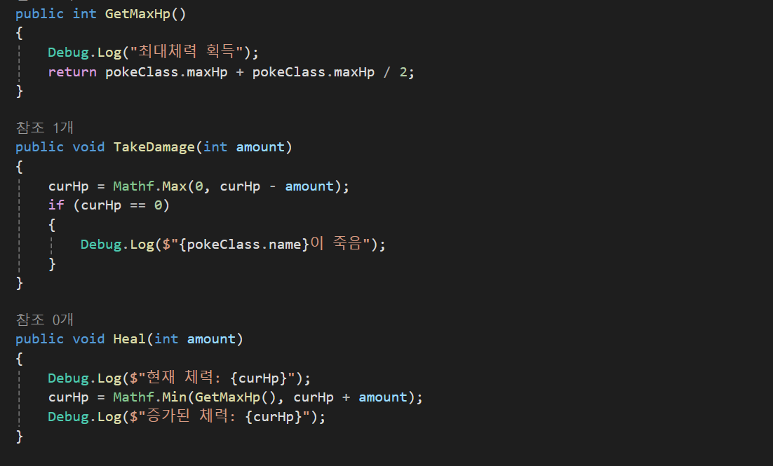 최대체력 증가와 데미지를 받으면 curHp를 Mathf.Max로 curHp가 0보다 작게 되는경우를 방지하기 위해 Max를 사용하고 Heal함수의 경우 최대체력보다 curHp가 놓으면 안되기 떄문에 GetMaxHp()에서 받아온 최대체력과 curHp + amount를 비교해 더 낮은 값을 curHp에 저장하게 설정하였다.