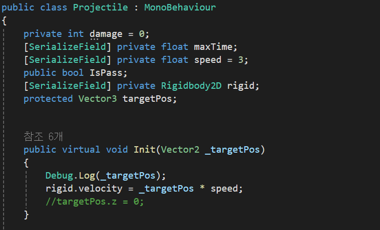 이전의 Attack을 실행할경우 나오는 Projectile로 virtual를 통해 일단은 오브젝트가 _targetPos방향으로 나아가게 설정하였다.