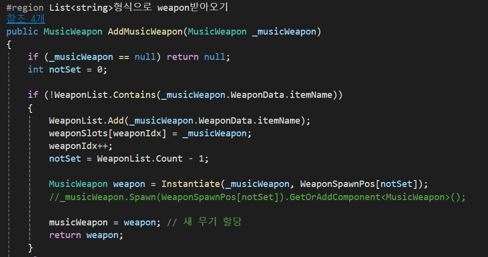 무기의 이름과 현재 리스트에서 해당무기의 이름이 없을경우 if문에 들어가고, 리스트에 추가, weapon에 Instantiate해서 오브젝트를 생성하고, MusicWeapon에 대한 weapon을 반환한다.