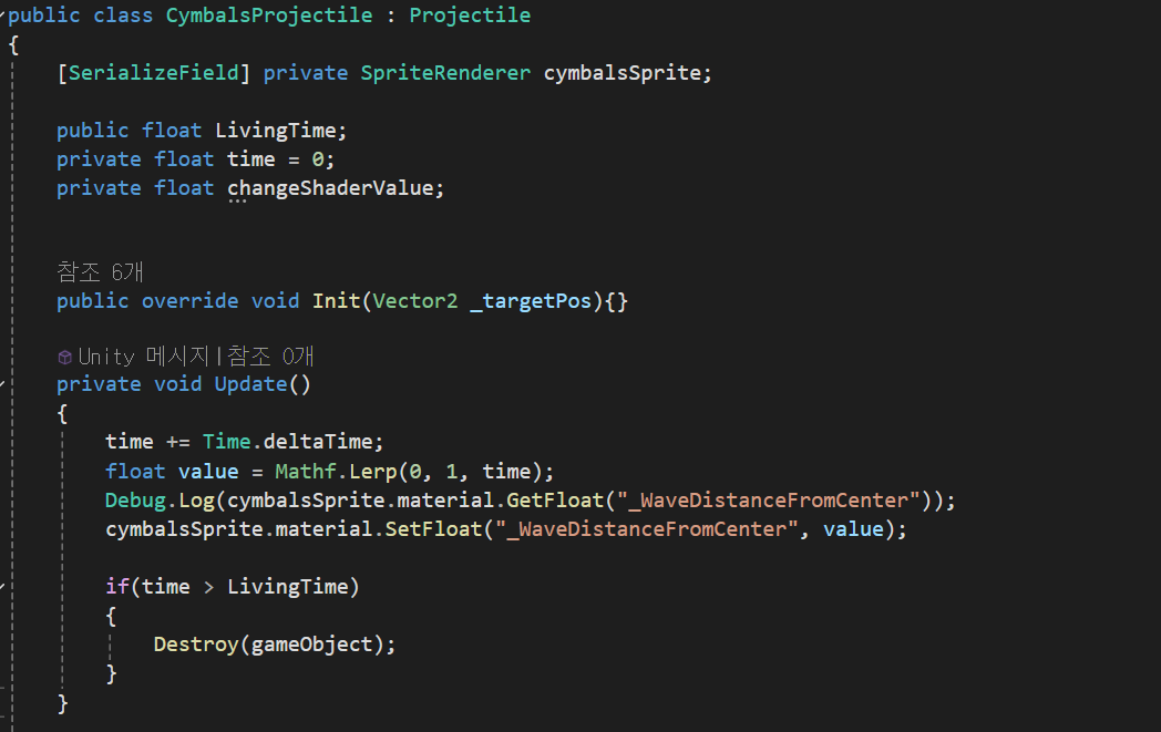 sprite를 받아와서 해당 스프라이트에 Material을 적용하고 그 지점에 material의 정보를 SetFloat를 통해 string의 이름을 가진 value를 사라지는 시간과 연결시키는 time을 통해 0~1까지 조절해서 진동을 구현하였다.