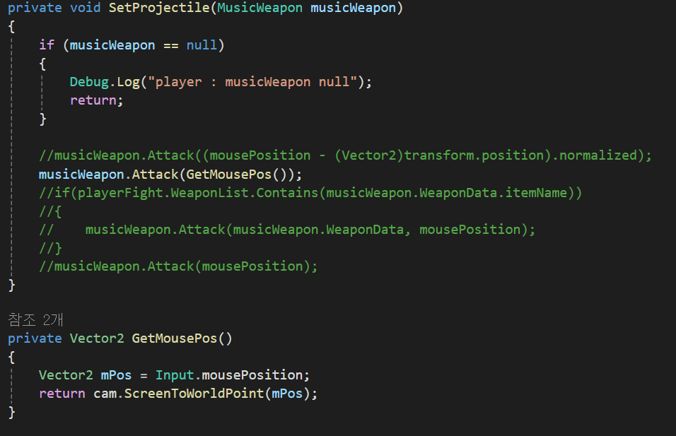 이전에는 GetMousePos와 SetProjectile이 같이 붙어있었지만 코드 정리를 통해 나누어졌다.