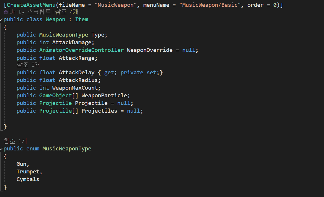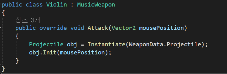 나는 Violin일 경우 Attack은 잘 동작되지만 안되는 이유를 아직 파악하지 못했다. 추후 더 알아본 후 접근할 것이고, 해결책은 앞의 AddMusicWeapon에서 MusicWeapon형식을 반환하는데 이 때 해당 반환된 정보를 AddMusicWeapon을 받아서 사용하는 오브젝트의 경우 무기의 Attack을 바로 사용하는 것이 아니라 반환된 AddMusicWeapon을 저장하고 저장된 무기를 Attack에 넣어주어서 오브젝트가 상호작용이 가능한 상태에서 실행하면 된다.