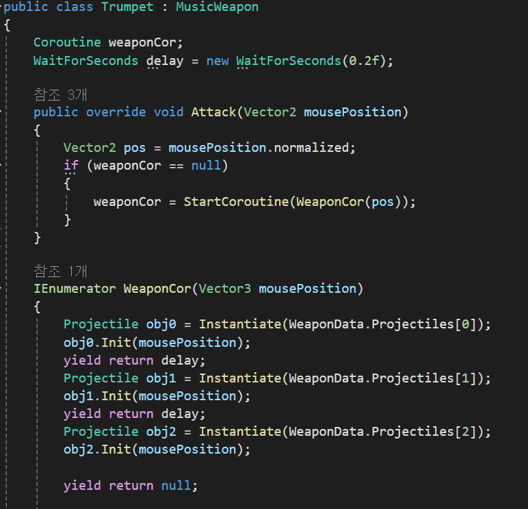 다음과같이 상속받아 실행하는 Attack은 가능하지만 Trumpet에서의 Coroutine은 오브젝트가 Inactive형식이라 설정되어(시각적 요소가 상호작용 되지 않는다) Coroutine이 동작하지 않는다.