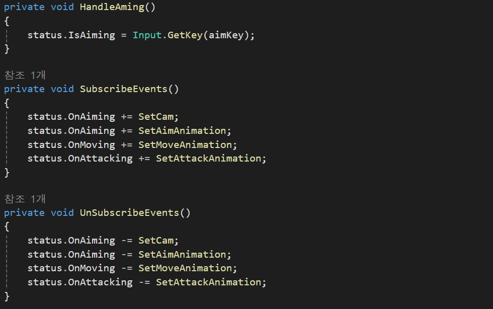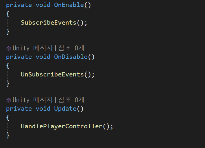 이벤트 함수를 구독,구독취소 할 함수를 En,Disable에 넣고 HandlePlayerController를 통해 지속적으로 플레이어에 사용 할 변수를 Update에 넣었다.