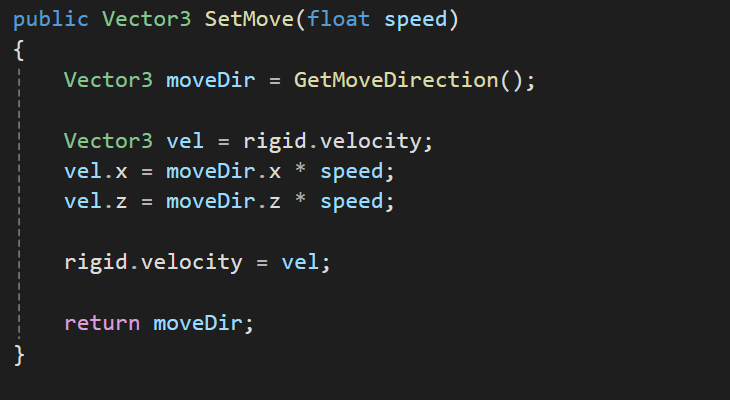 SetMove : 방향을 가져와서 x,z * speed를 적용해서 rigid.velocity - 가하는 힘이 바로 적용 될 수 있도록 구현