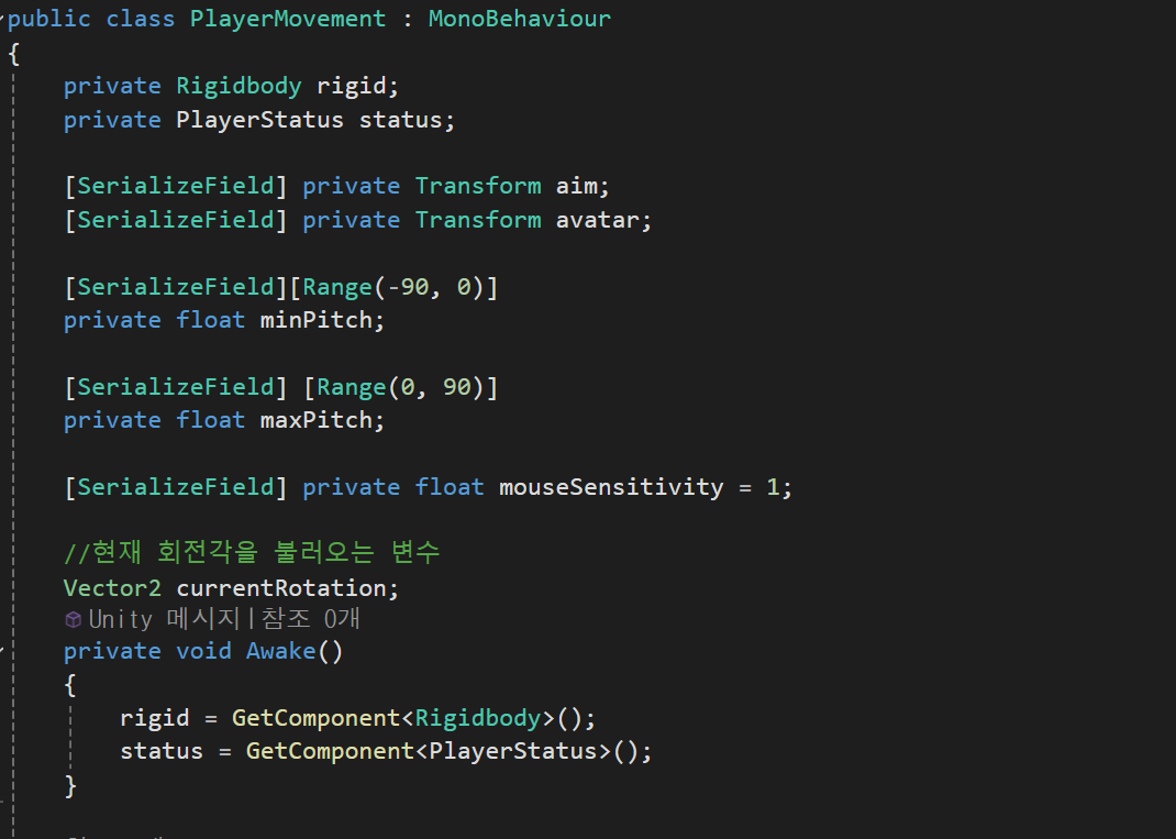 카메라의 위치에 따른 시점 회전을 위해 aim,avatar Transform을 직렬화, Clamp로 회전 최대각을 걸어주기 위해 min,max Pitch, 마우스 감도 mouseSensitivity,