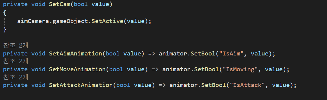 그리고 만약 플레이어가 일반 움직임을 하다 에임을 해야할경우 해당 에임 카메라 방향으로 쳐다봐야 하기때문에 transform.forward를 통해 에임 카메라의 방향을 앞으로 설정 하였고 방향(normalized)을 반환하여 SetAimRotate의 Vector3를 반환하였다.