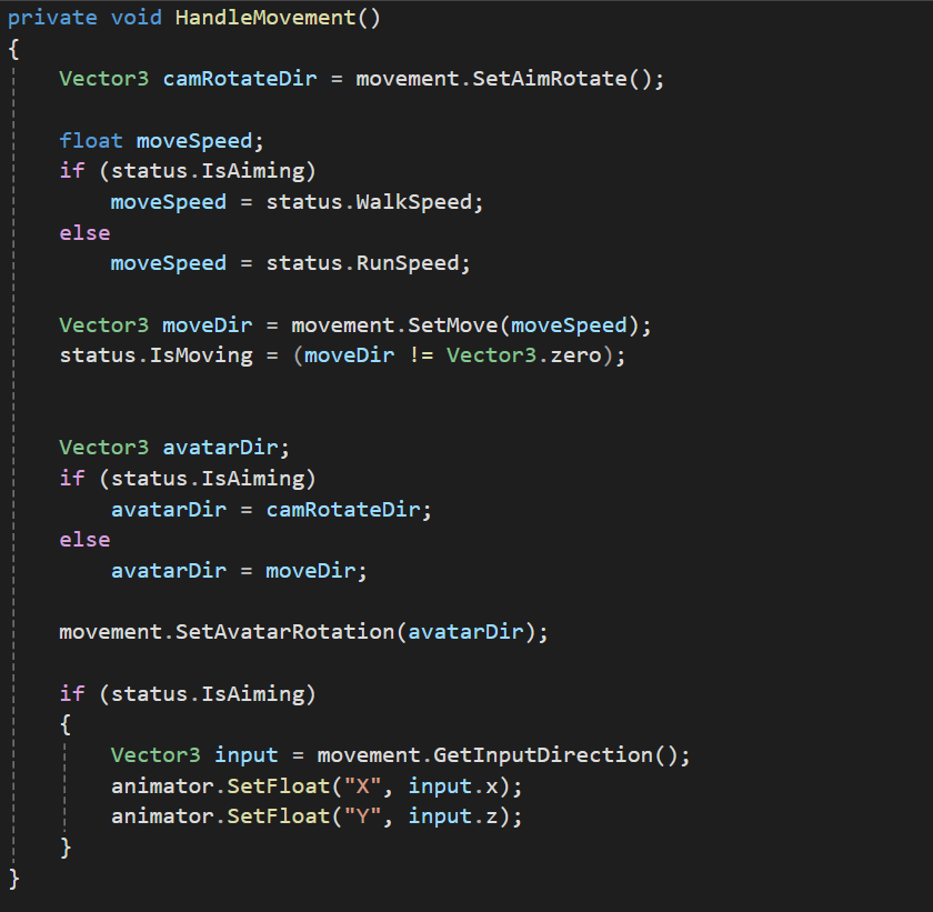 이를 PlayerMovement.SetAvatarRotation에 avatarDir을 넣는데 이 때, 에임 상태일경우는 따로 지정해서 회전을 설정하고, 아닐경우 일반적인 플레이어의 움직임으로 회전을 사용한다.