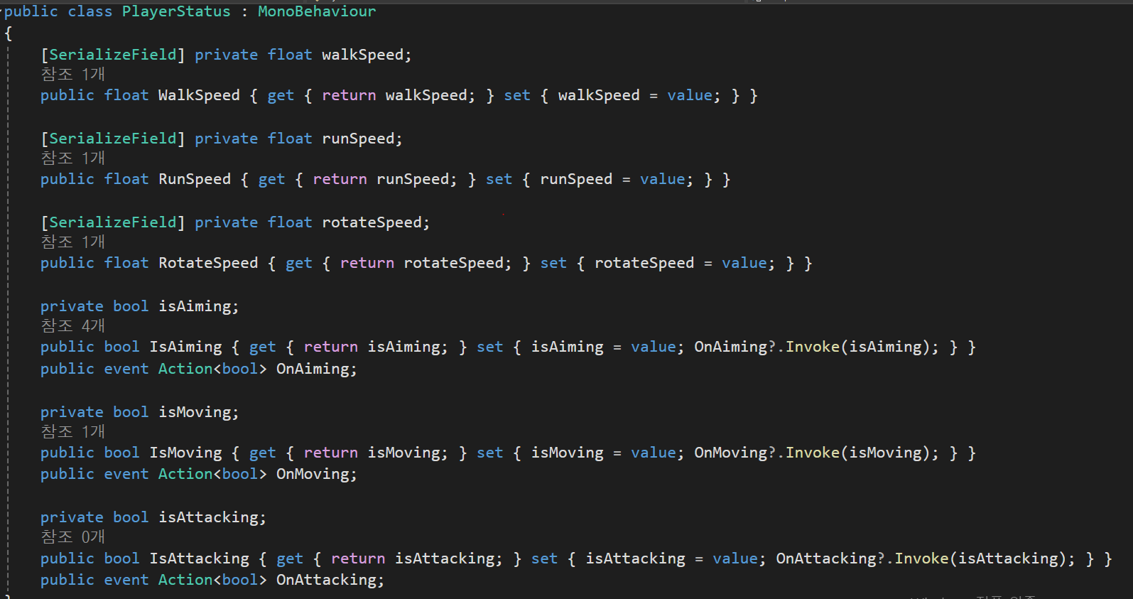 SetAimRotate의 정보를 camRotateDir에 저장 PlayerStatus에서 IsAiming이 true일경우 moveSpeed와 false일경우 moveSpeed를 달리해서 PlayerStatus에서 WalkSpeed, RunSpeed를 가져온다.