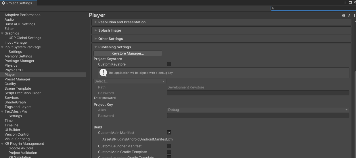 먼저 프로젝트 세팅에서 publishing settings에서 custom Main amnifest를 체크해준다. 그리고 해당 파일을 따라가서 안드로이드 Permission에 따라 어떤 권한을 필요로 하는지 설정해준다.