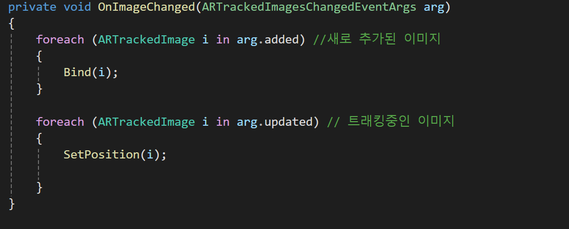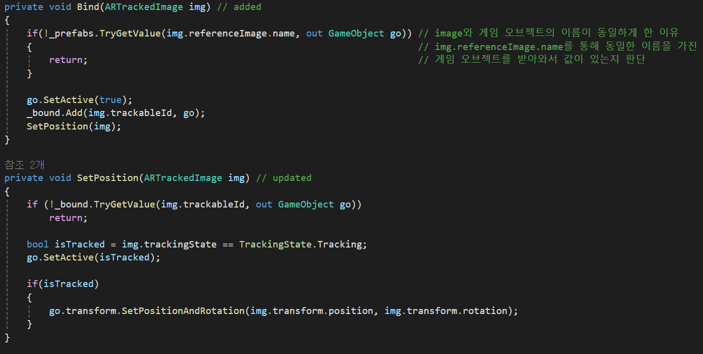 Bind : ARTrackedImage를 받아와서(반복문을 통해 가져온 이미지) 해당 이미지가 키와 값이 존재하지 않을경우 실행되지 않도록 하고 만약 딕셔너리에 존재 한다면 true, _bound딕셔너리에 Add해주고 위치를 지정해준다.