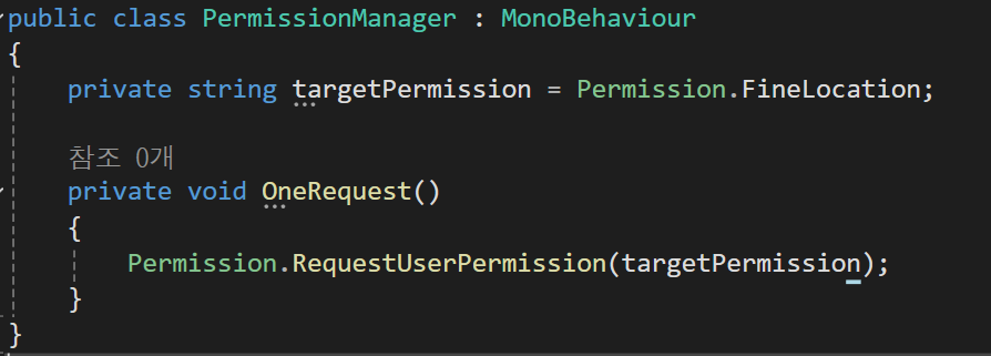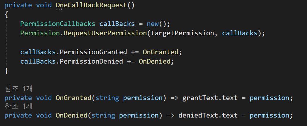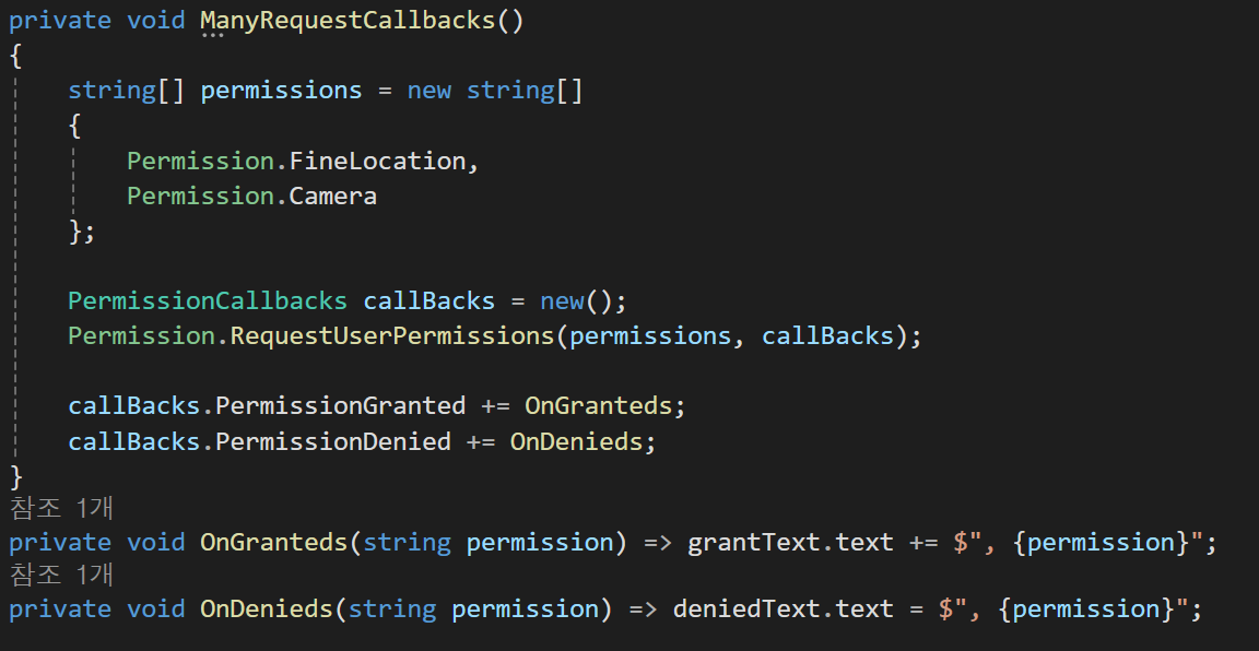 RequestUserPermission(오버라이드) : 유저에게 permission을 요청함 + callbacks
