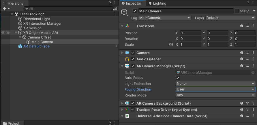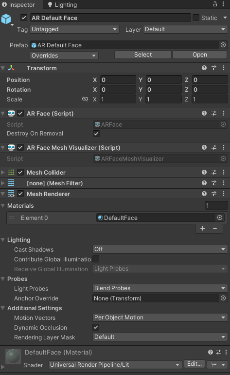 AR Default Face에 해당 머티리얼을 적용시켜준다. 그리고 XR Origin에서 AR Face Manager를 적용 한 후 Default Face를 적용시킨다.