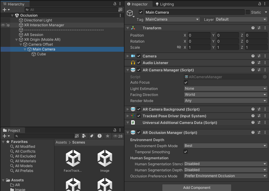 XR Origin에서 하위 오브젝트인 Camera를 선택한 후 카메라 하위 오브젝트에 원하는 프리팹을 넣고 AR Occlusion Manager를 넣어준다.