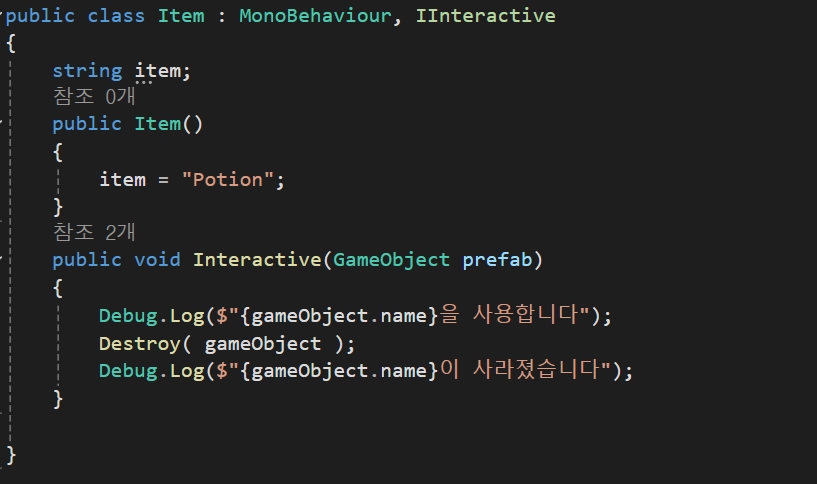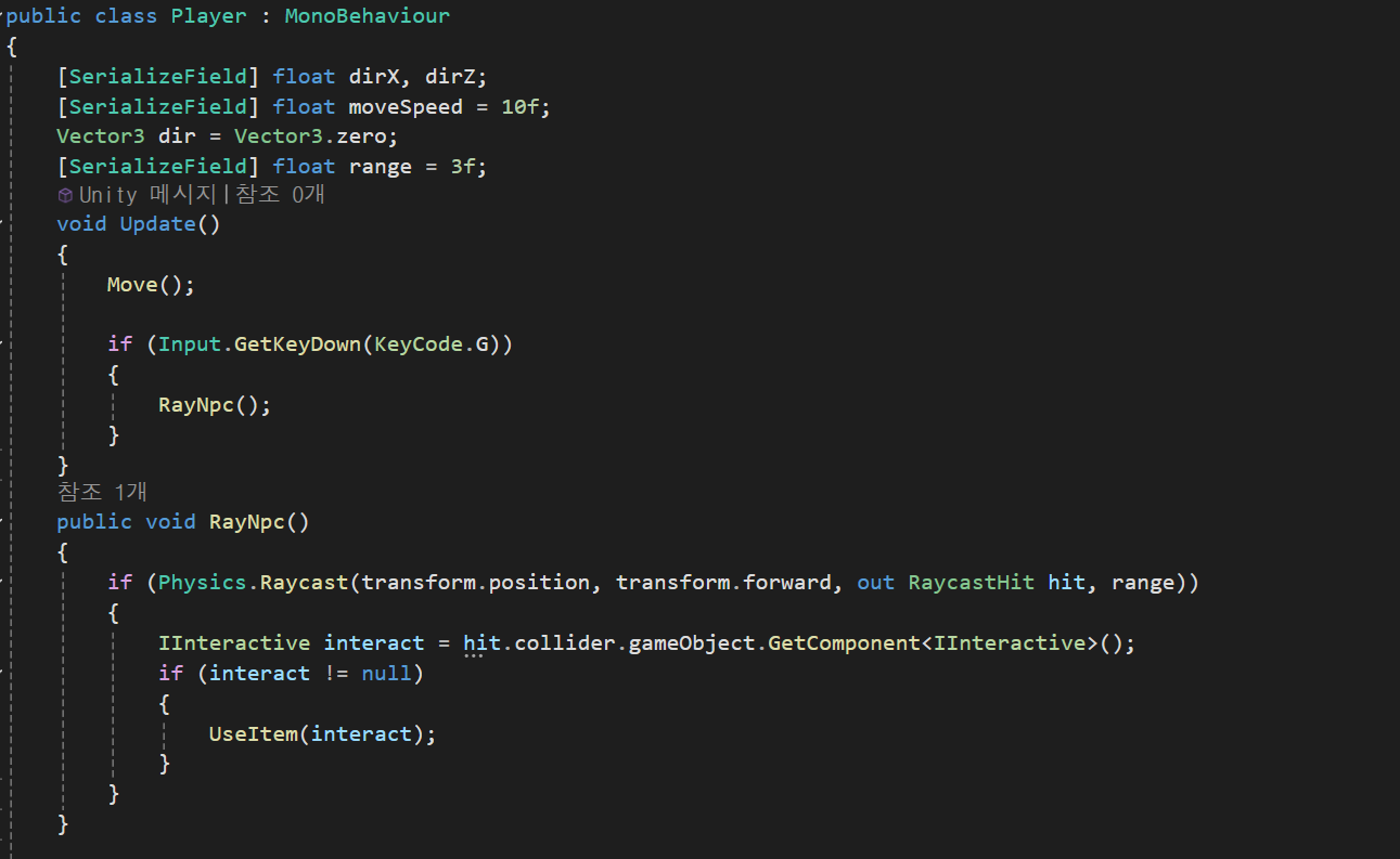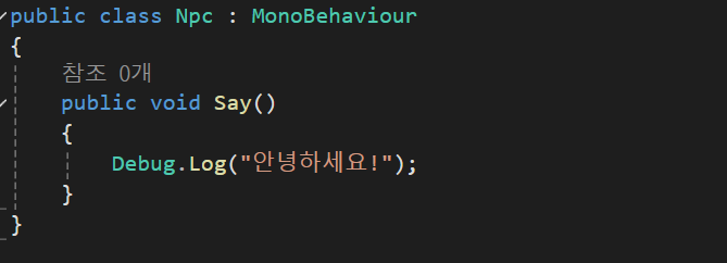 npc는 상호작용으로 인사말 함수를 구현하였다.