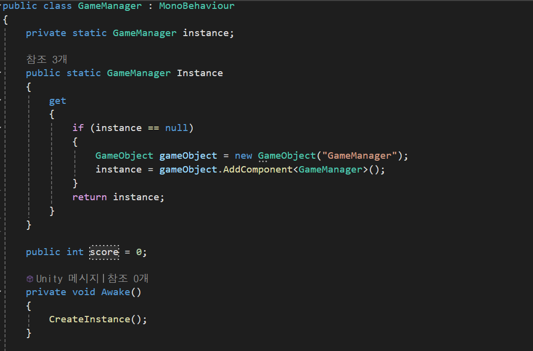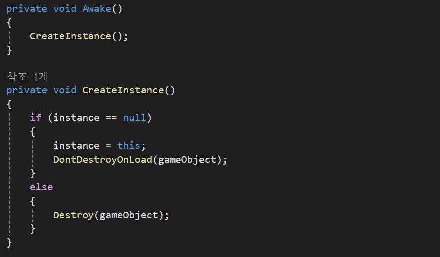 Awake에서 CreateInstance()를 실행하는데 Awake에서 instance가 존재하지 않을 때 instance를 현객체를 사용하고 DontDestroyOnLead를 통해 씬을 변경하거나 어디서든 정보를 저장하도록 설정한다. 만약 instance가 있을경우 뒤에 만들어진 GameManager는 삭제한다.