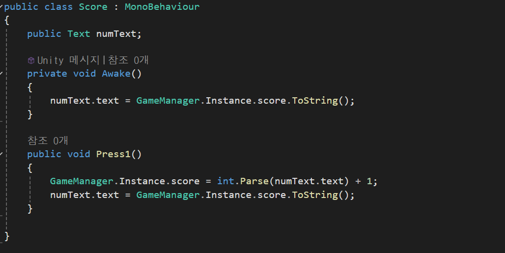 GameManager의 score를 level1, level2 모두 영향이 가도록 스코어를 지정해주었고 버튼을 누를때마다 GameManager의 score가 하나씩 상승하게 구현하였다.