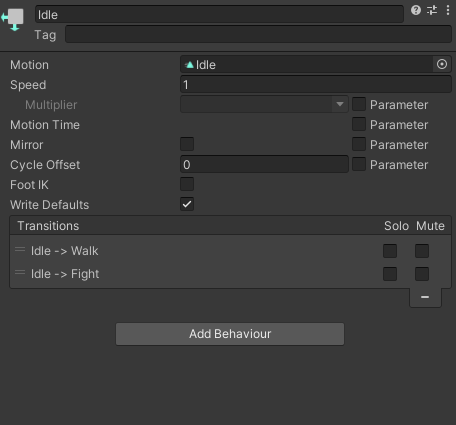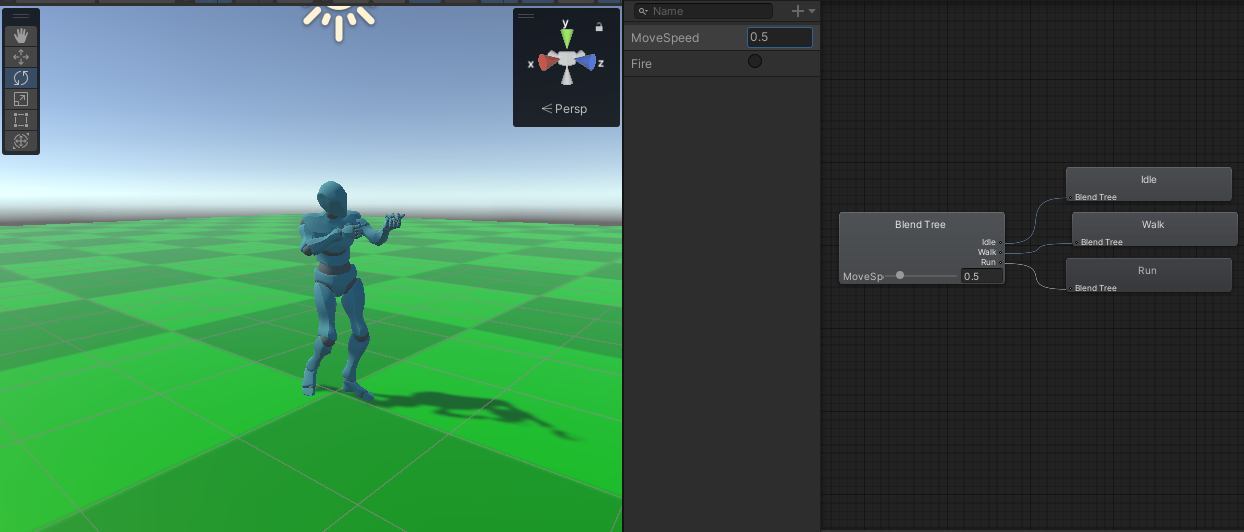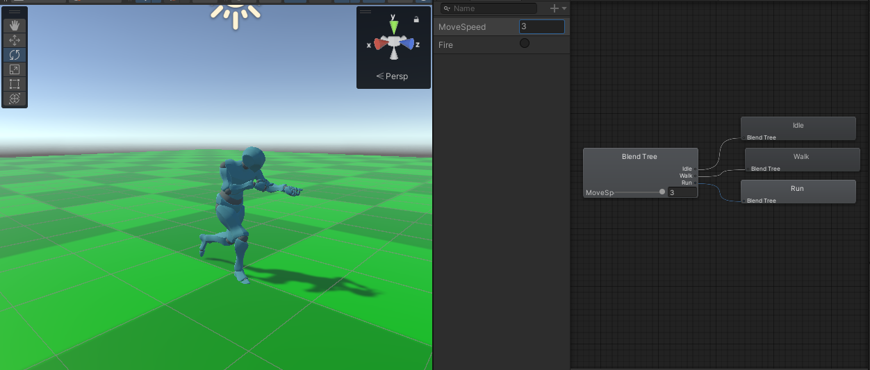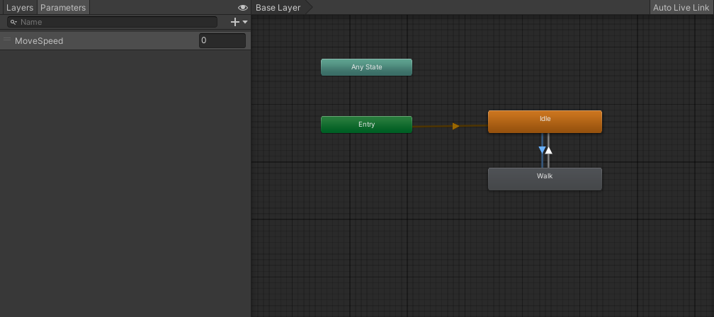 animator에서 idle, walk 애니메이션 클립을 넣어주었고 parameter(model)에 MoveSpeed, Idle을 default state로 지정해주었다