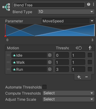 blend Tree의 경우 자연스럽게 변경할 수 있도록 애니메이션을 설정해줄 수 있다. (Threshold를 통해 가중치 부여하여 조정)
