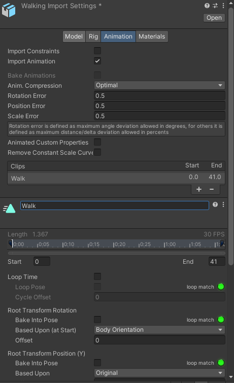여기서 중요한게 있는데 선택하여 적용한 애니메이션이 유니티 기준으로 설정되지 않기때문에 유니티 기준으로 설정 해주어야한다.