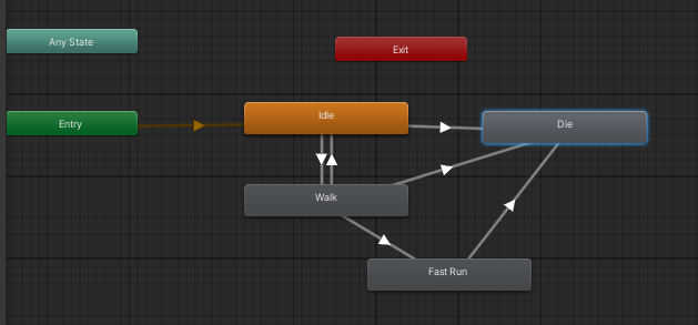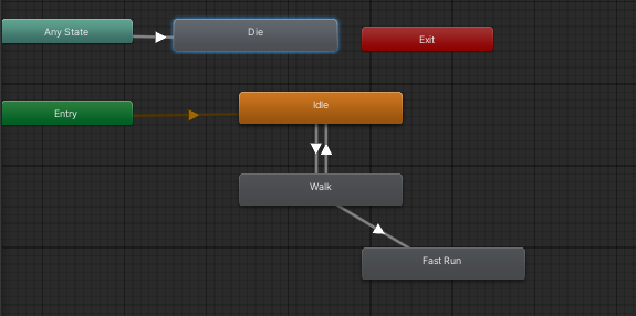 모든 상황에서 Die 클립을 가르키고 있어야 하는데 이경우 클립이 다양할경우 매우 복잡해 질 것이다 이러한 경우에서 AnyState 어떤 상태든 조건을 만족하면 실행하는 경우에 붙여준다.
