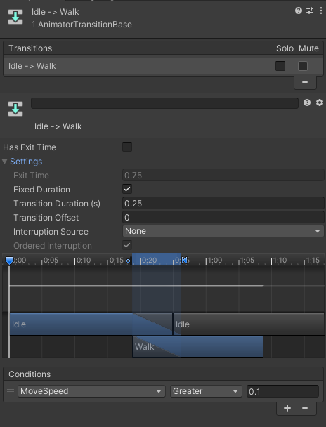 idle에서 walk로 바뀌는 조건은 MoveSpeed가 0.1 보다 클 경우 그리고 Has Exis Time을 통해 idle애니메이션이 끝나지 않아도 바로 walk애니메이션을 실행하도록 설정하였다.