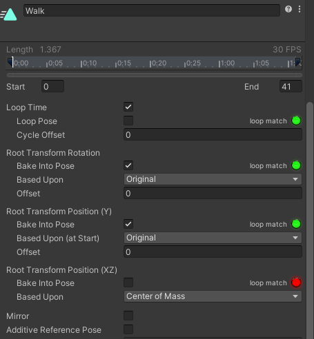 loopMatch에 애니메이션 처음과 마지막의 상태가 같을경우 초록색 (죽은경우 빨간색)
