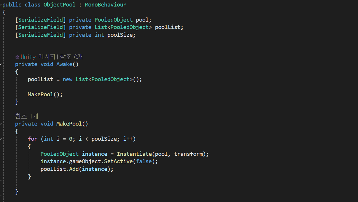 미리 오브젝트를 생성하고 오브젝트의 SetActive를 비활성 시킨 후, 필요한 상황에 꺼내서 사용할 수 있는 디자인 패턴으로 인스턴스와 삭제의 메로리 단편화가 심해지는 상황을 해결할 수 있는 디자인 패턴이다.