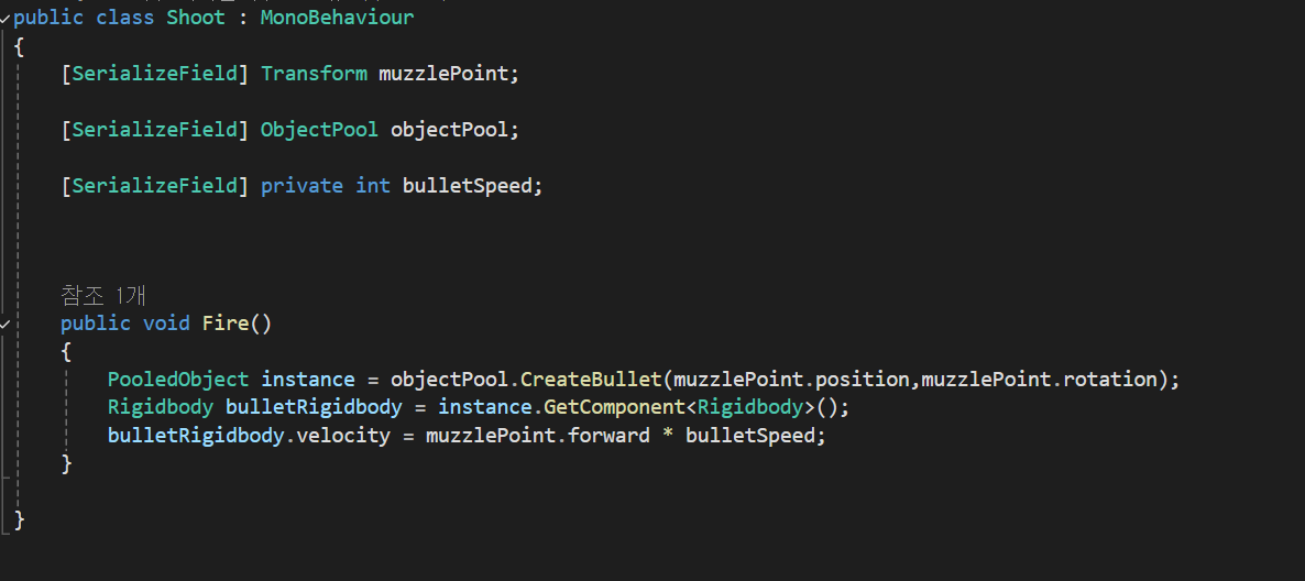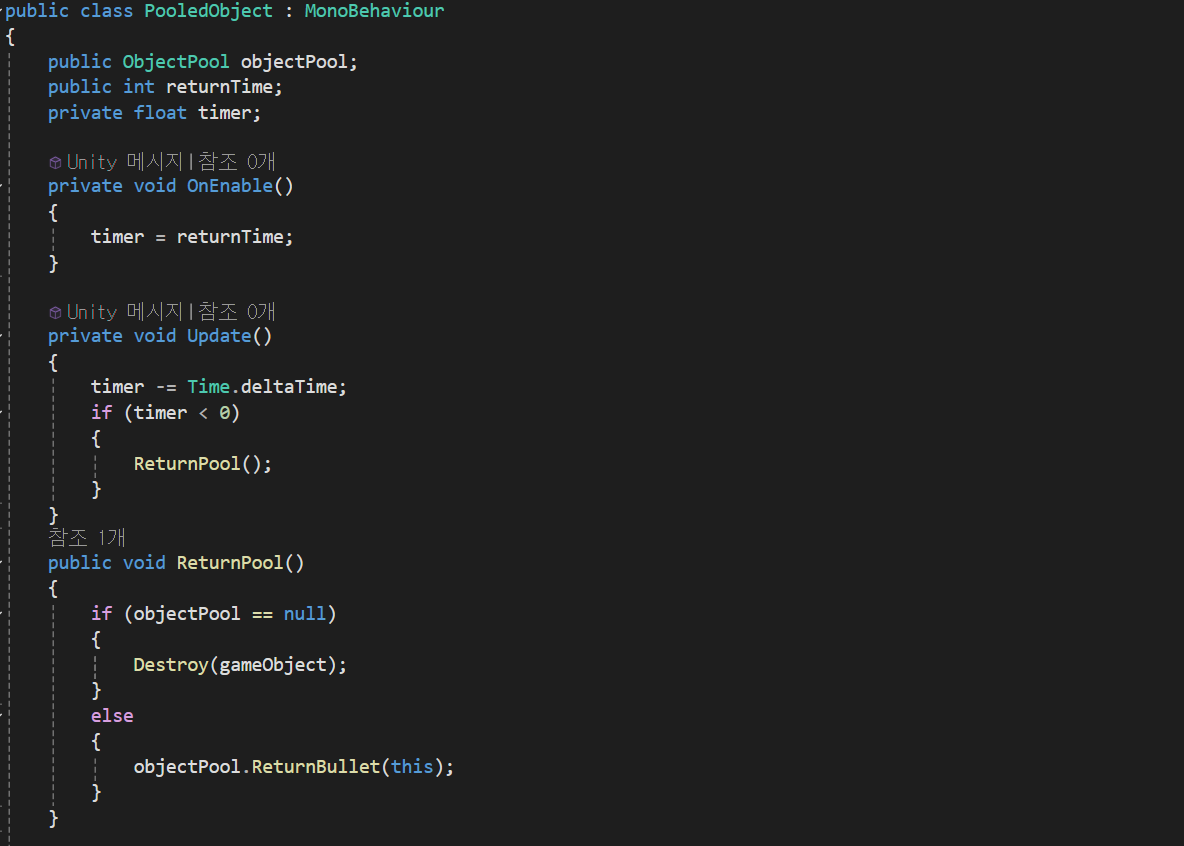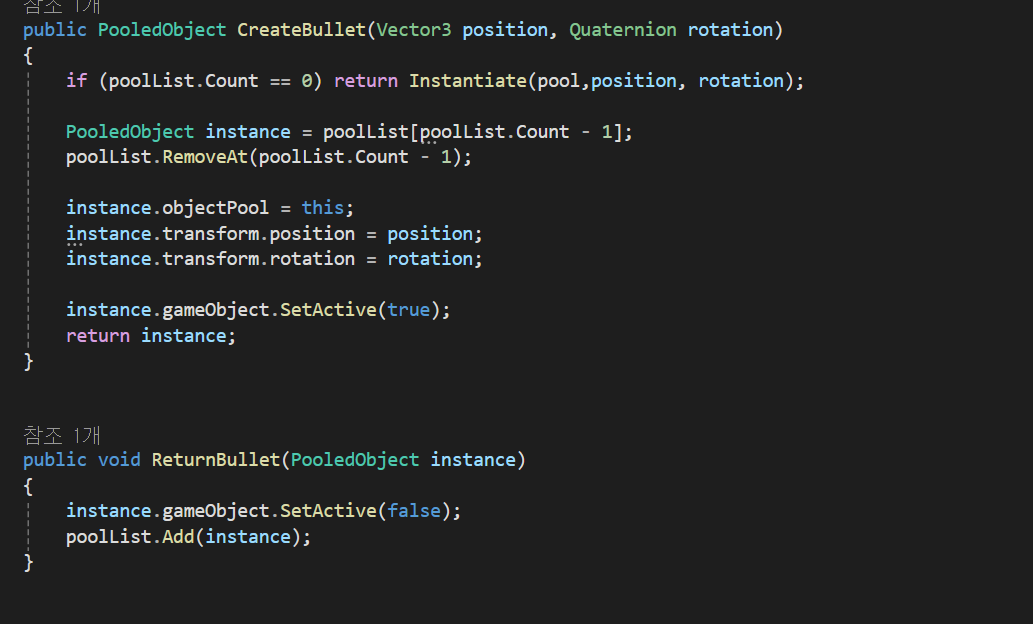 &주의사항으로 instantiate와 destroy의 경우 메모리 단편화가 일어난다 이런 경우를 해결하기 위해 사용하는 디자인 패턴중 하나로 ObjectPool이 있다.