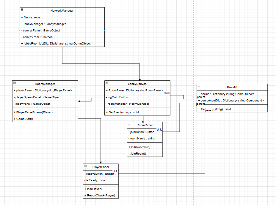 다음과같이 BaseUI를 통해 상속한 ui들을 Manager와 큰 틀인 Canvas에서 작은 단위인 ui들을 생성하고 로비와 룸을 구성해서 Network를 구성할것이다.