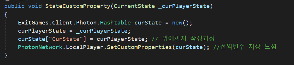 방이 생성이 됐을 때 다음과 같이 커스텀프로퍼티를 설정해서 현재 플레이어의 상태를 해시테이블에서 플레이어의 Enum을 설정하도록 구성하였고 아직 완성하지는 못했다.