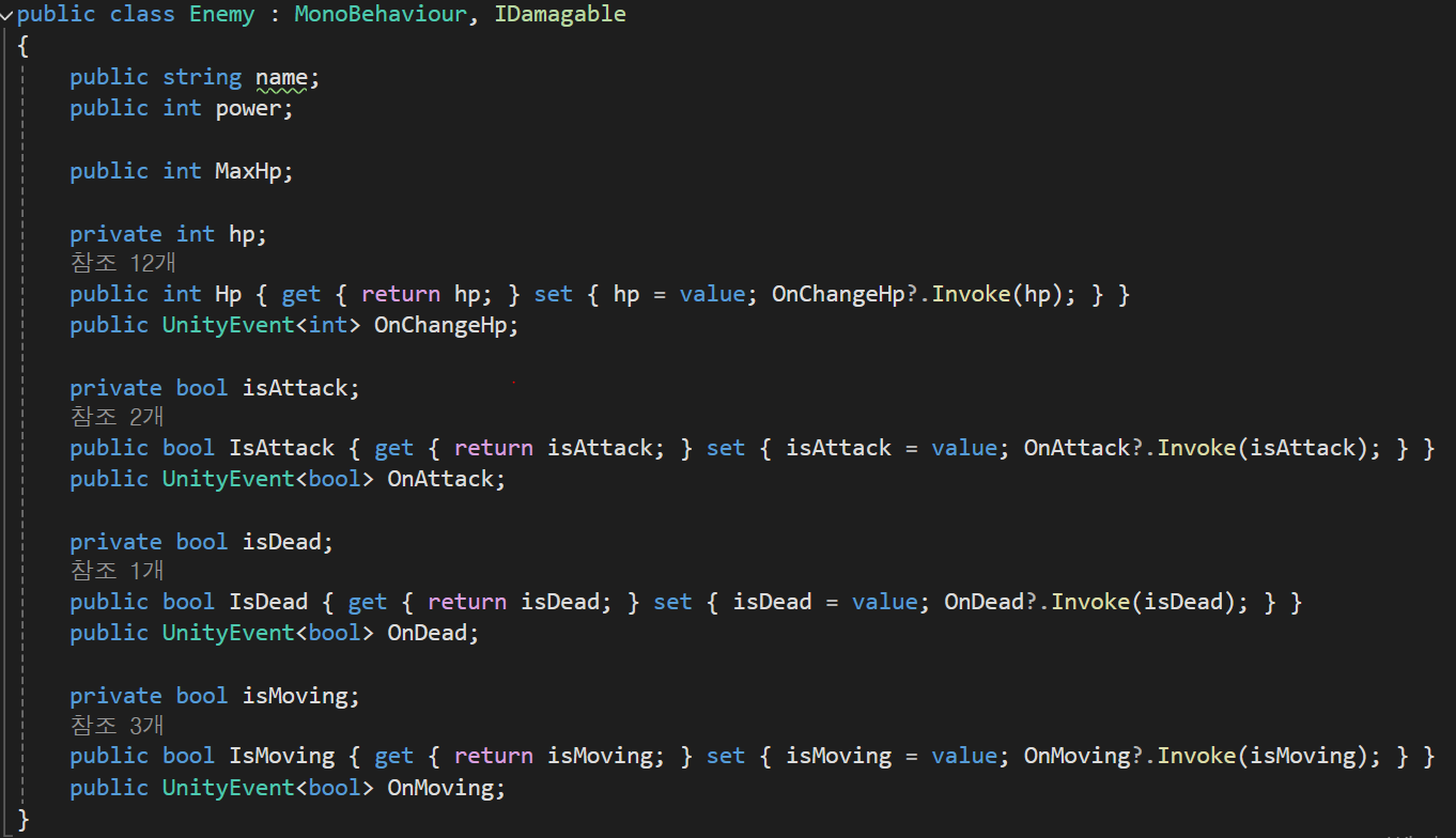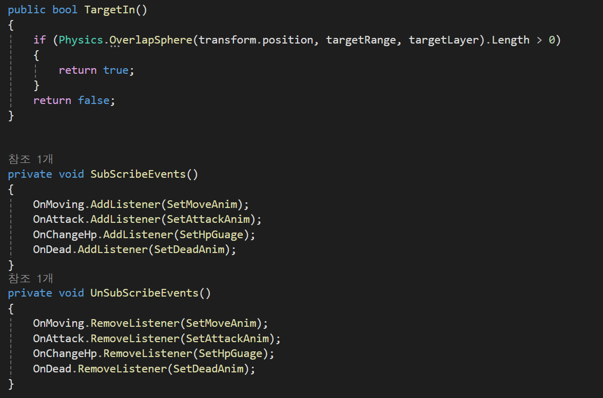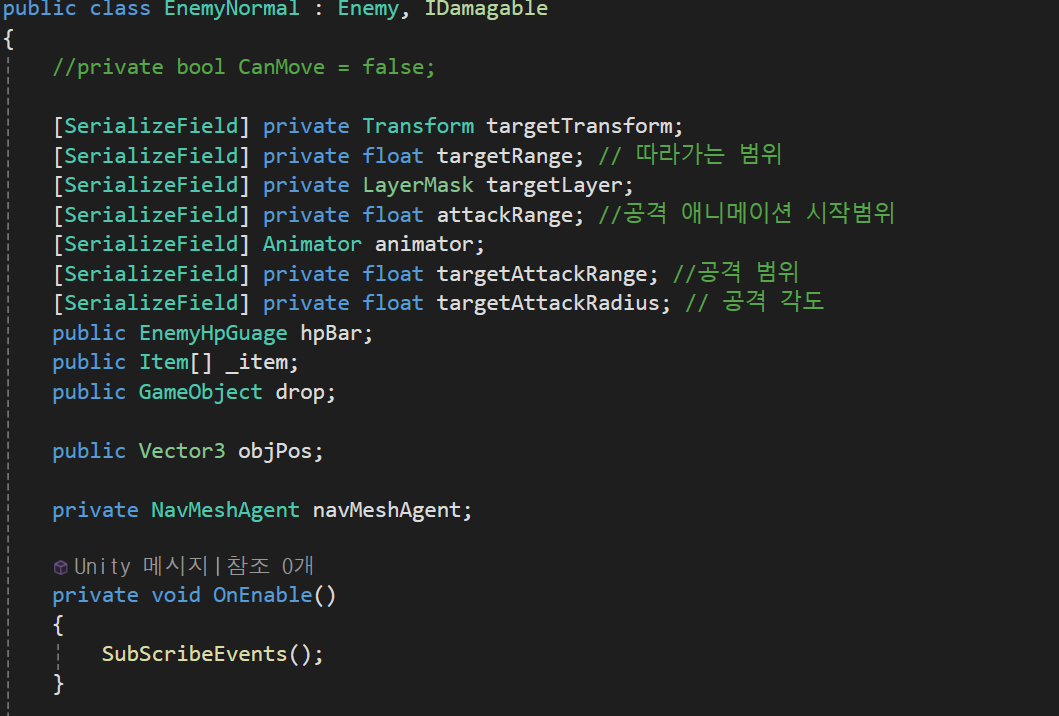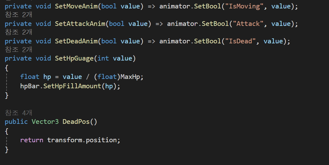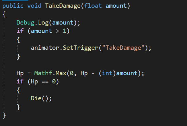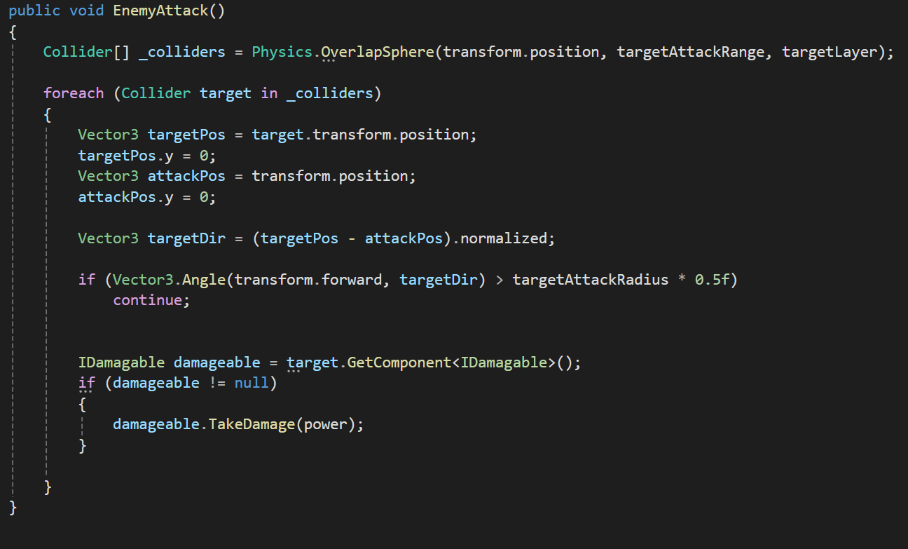 플레이어와 비슷하게 애니메이션 이벤트를 사용해서 공격한 내적을 구해 범위를 구성하고 IDamageable을 통해 Takedamage를 구성
