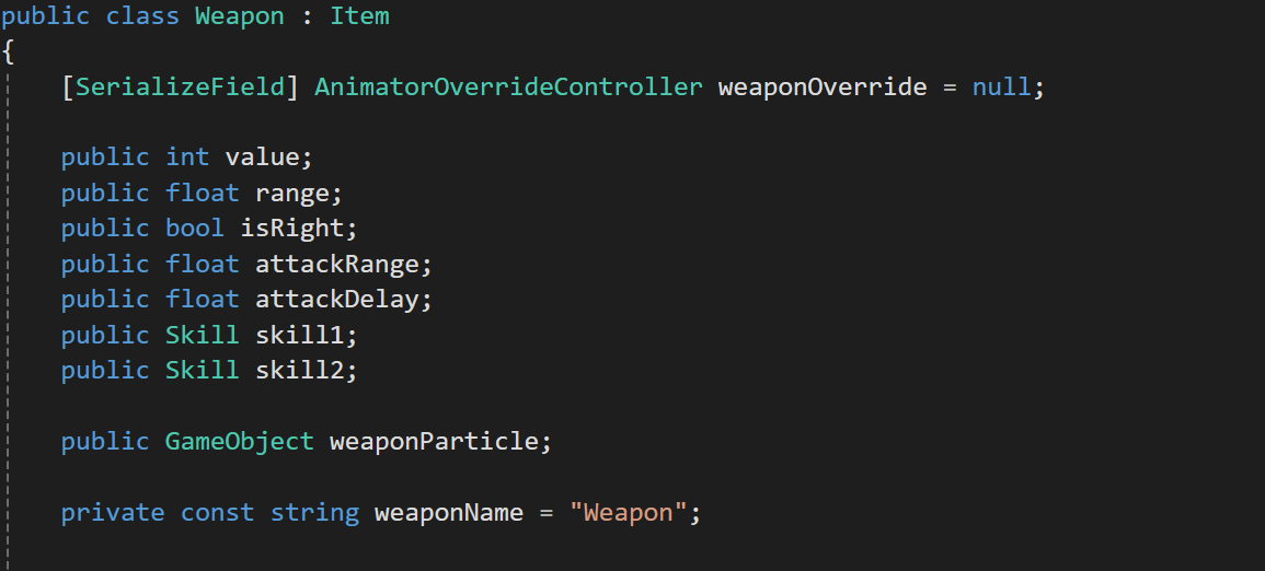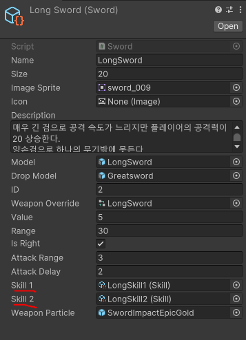 Weapon - Sword - Skill1, Skill2를 넣고 아이템이 바뀔 때 스킬도 같이 바뀌면서 데미지도 바뀌게 설정 해줄 것이다.