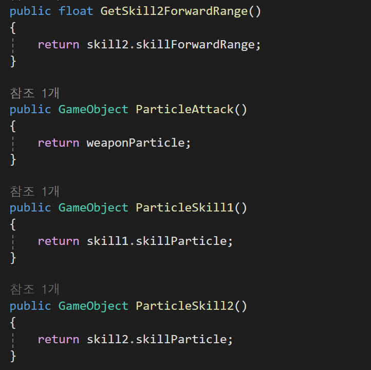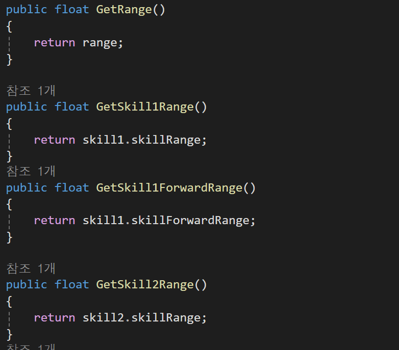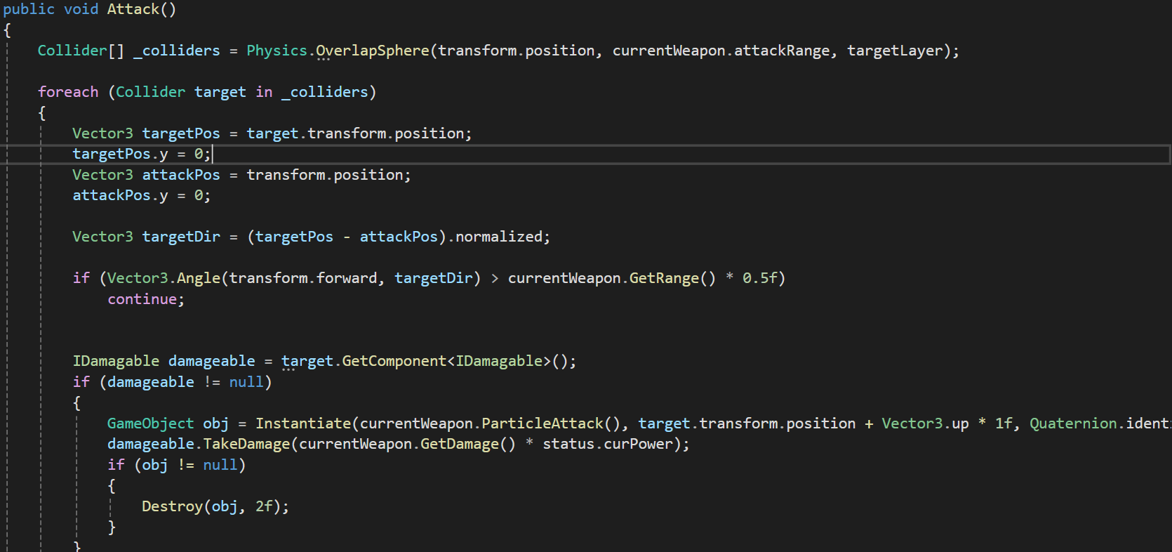 일반 마우스 왼쪽클릭은 애니메이션 이벤트를 통해 Attack이 실행되고, skill1은 Skill1Attack, skill2는 Skill2Attack이 실행되는데 이 때 범위와 스킬당 공격력 그리고, 내적 각을 이용해 각범위를 정해서 오브젝트가 맞을 범위와 데미지를 구현해서 IDamagable의 TakeDamage를 불러온다.