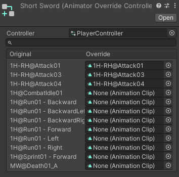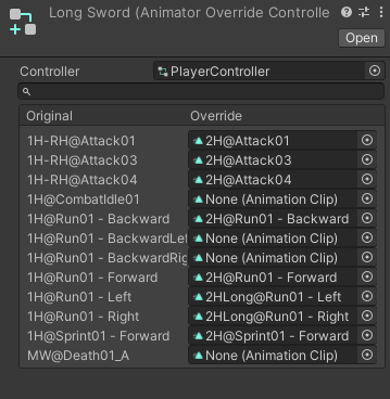 먼저 두개의 Animator Override Controller를 설정해서 해당 애니메이션이 실행될 때 다른 애니메이션이 실행 되도록 만들어 주었다.