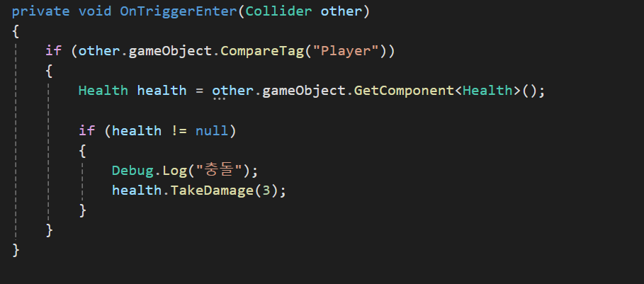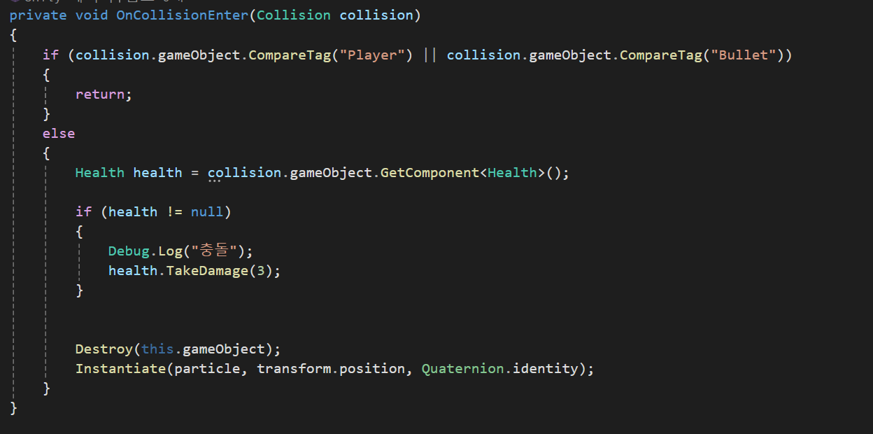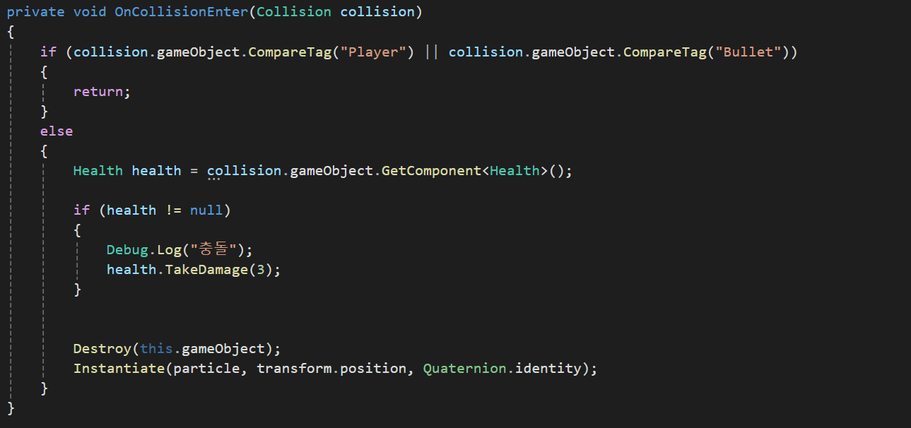 Bullet 클래스의 경우에 CollisionEnter를 사용하여 Player나 Bullet이 아닌경우 게임오브젝트를 삭제시키고 파티클 시스템을 실행하게 만들어주었으며 만약 Health Component를 가진 오브젝트와 접촉시 health.TakeDamage를 실행하게 만들어줬다.