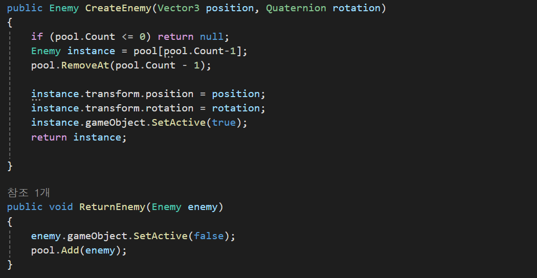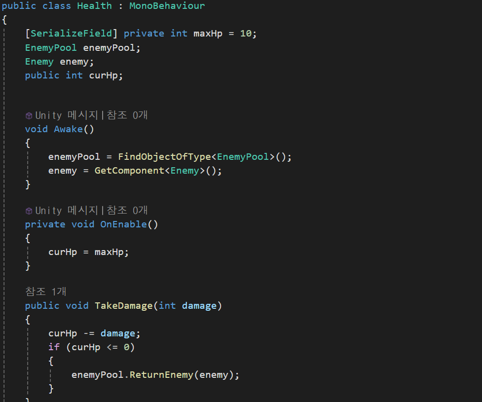 데미지를 받는 함수와 체력이 떨어졌을경우 ObjectPool의 ReturnEnemy 함수를 실행시키도록 구현하였다.