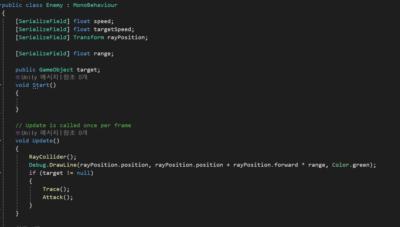 마지막으로 enemy클래스에서 레이케스트를 작성하고 ray의 범위와 함께 오브젝트를 따라가는 기능과 ray의 범위안에 들어왔을경우 Attack함수를 실행하도록 구현하였다.