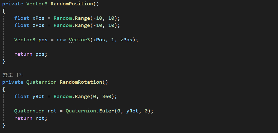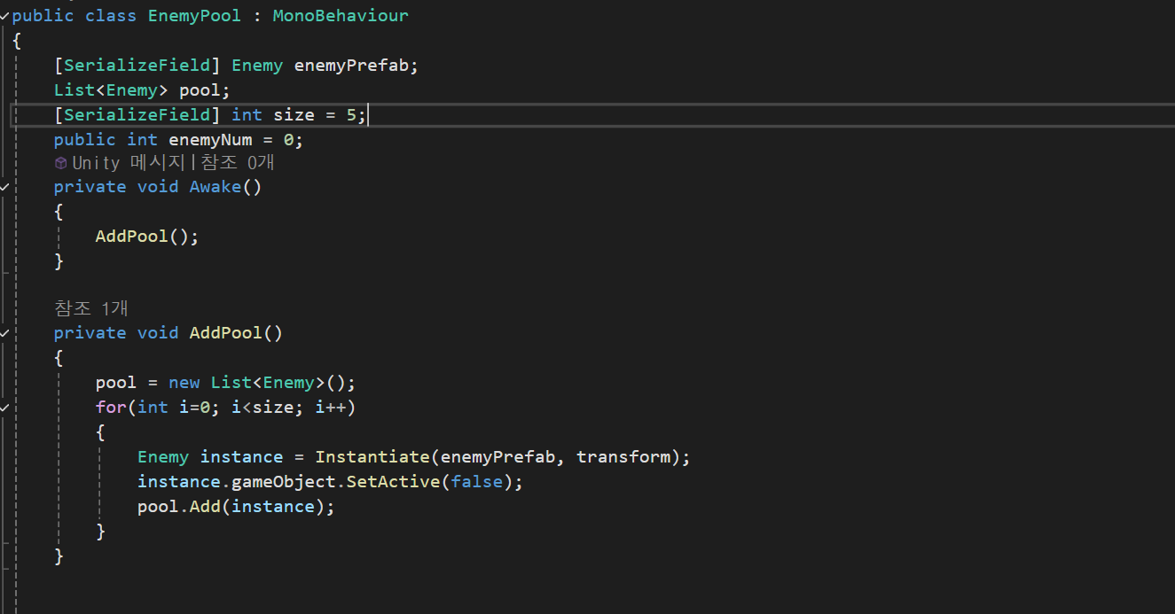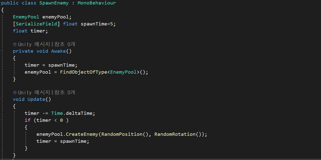 먼저 enemy에 대한 ObjectPool 패턴을 생성하고 -10 ~ 10 까지의 랜덤 범위에서 5초마다 오브젝트를 생성하게 만들어주었다.