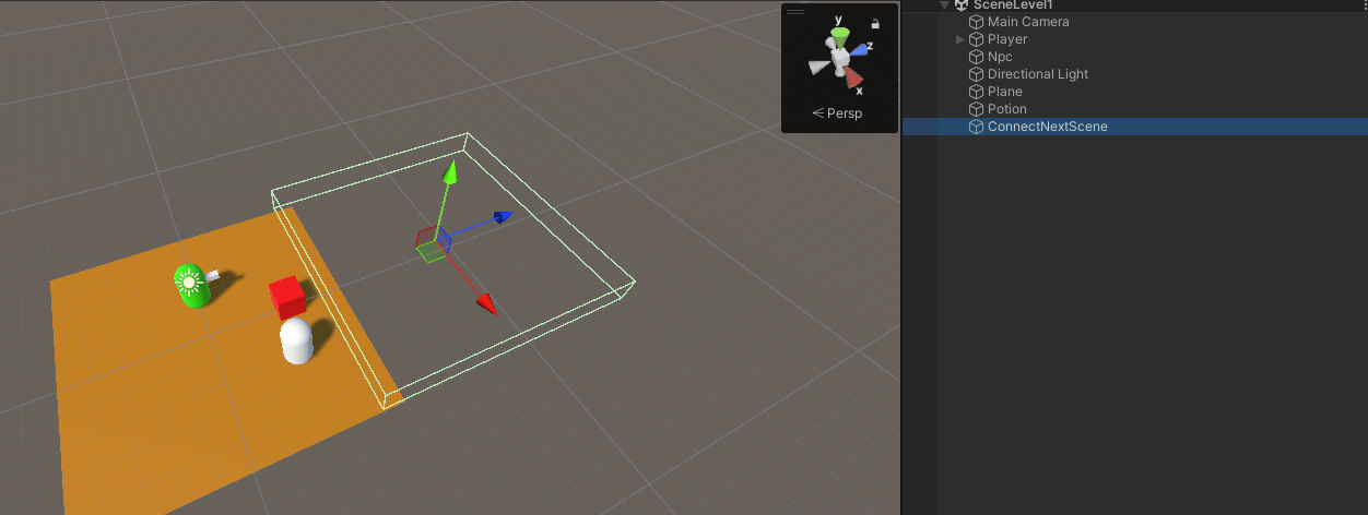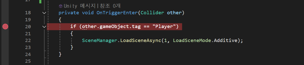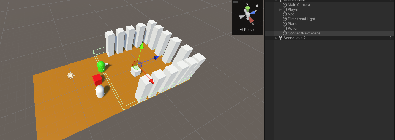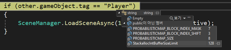 이렇게 다음씬의 로딩을 연결하여 구현하게되면 다음 씬의 오브젝트가 미리 구현된것이 아니라 씬이 생성되자마자 적(기타 오브젝트)과 내가 씬 생성 했을때의 상호작용이 가능하다