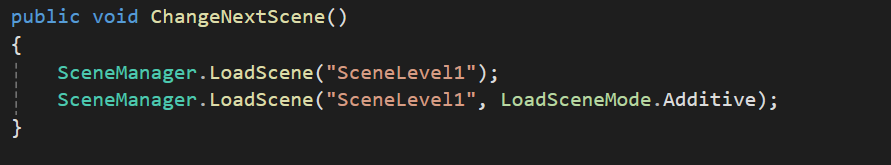 이 때 LoadSceneMode.Additive를 사용할 경우 이전의 데이터를 유지하고 다음씬으로 넘어가는 역할을 한다.