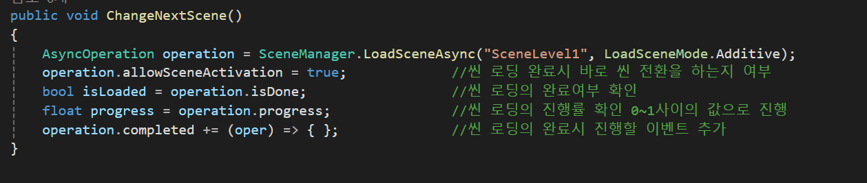 LoadSceneAsync에 대해 더 자세히 살펴보자면 AsyncOperation을 사용하여 비동기씬의 더 부드러운 씬전환 방법을 제공한다