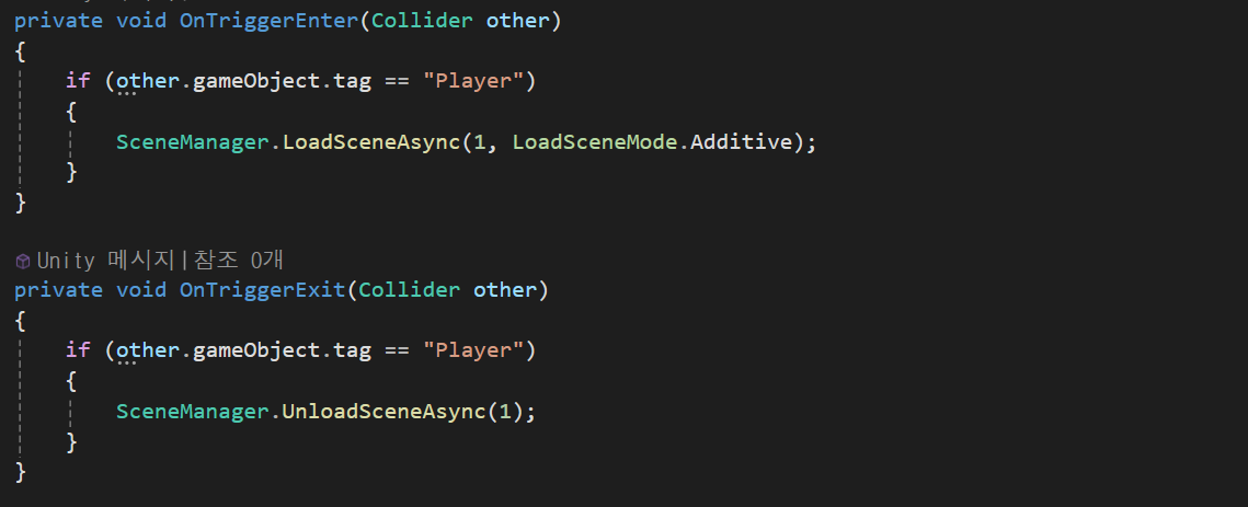 비동기 씬전환을 이용해 이전씬과 다음 씬을 연결한 후 trigger를 통해 씬의 연결과 연결을 끊는것을 구현했다.
