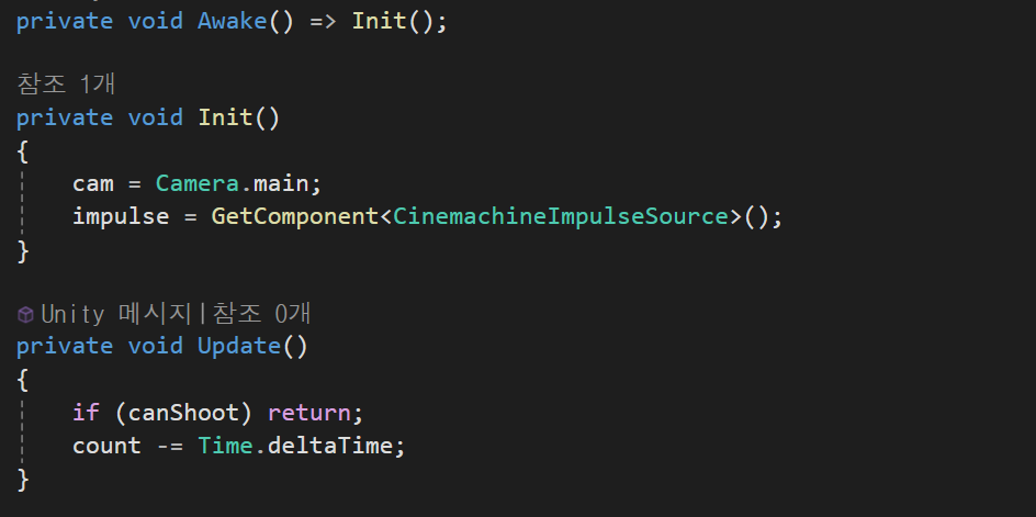 Update에서 count의 시간에 따라 canShoot의 true,false를 정하고,