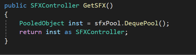 GetSFX : SFXController의경우 PooledObject에 오브젝트 풀에서 Deque를 실행하는 함수를 저장하고 그 객체를 하위클래스인 SFXController에 다운캐스팅을 실행한것을 반환한다.