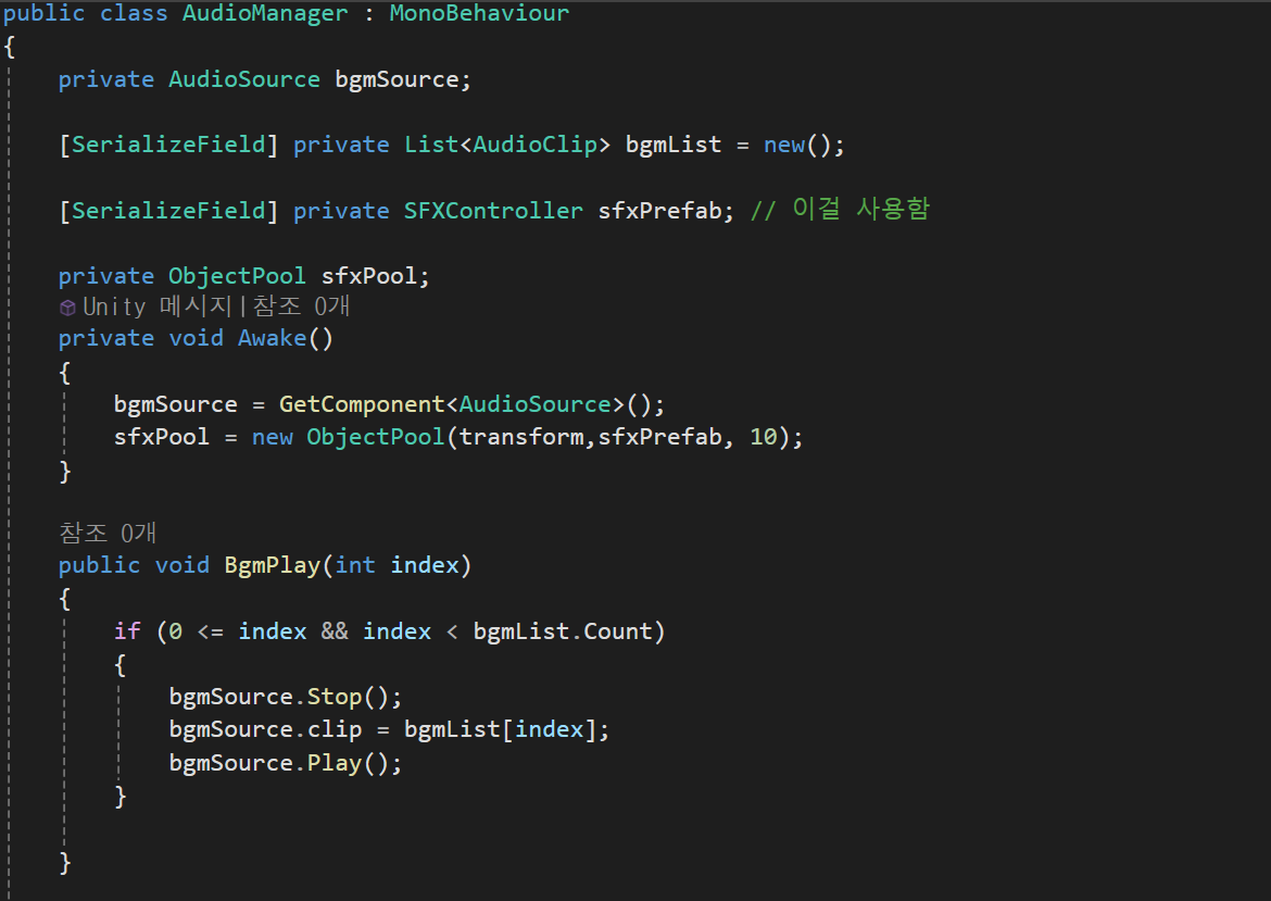 오브젝트 풀을 사용하기 위해 부모객체는 현재 객체, 실행파일, 크기를 지정해주고, BgmPlay를 통해 index가 바뀔경우 즉 다른 파일을 실행할경우 이전의 파일은 정지한 후 bgmList의 해당 인덱스 파일을 실행한다.