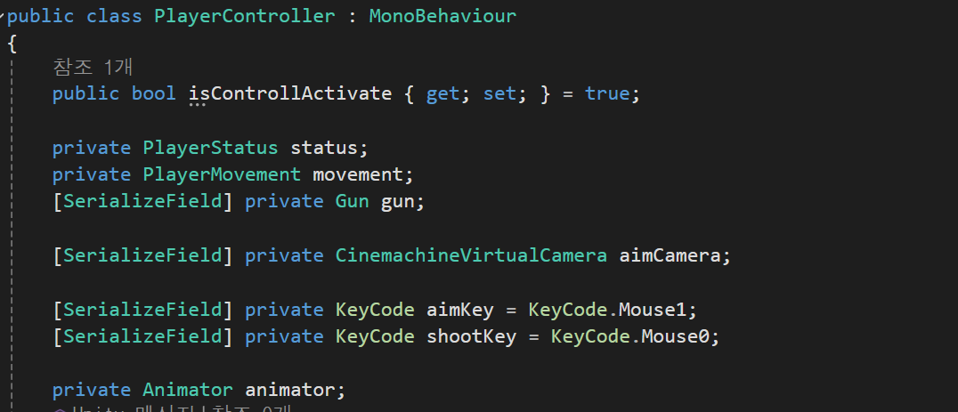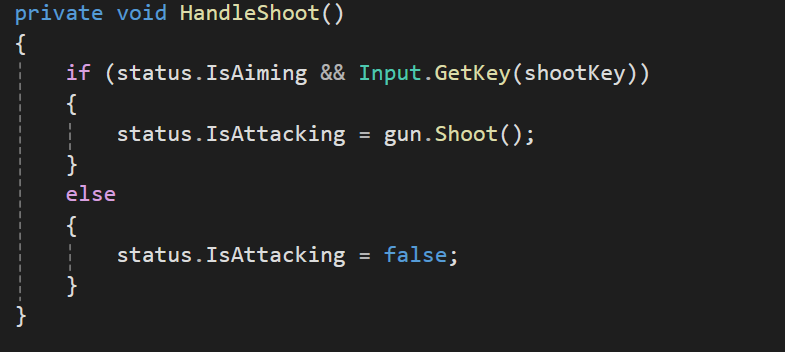 PlayerStatus의 IsAiming상태 + 마우스 왼쪽을 누를경우 PlayerStatus의 IsAttacking상태를 Gun의 Shoot함수의 true,false를 할당한다.
