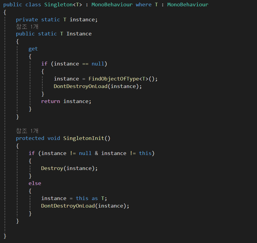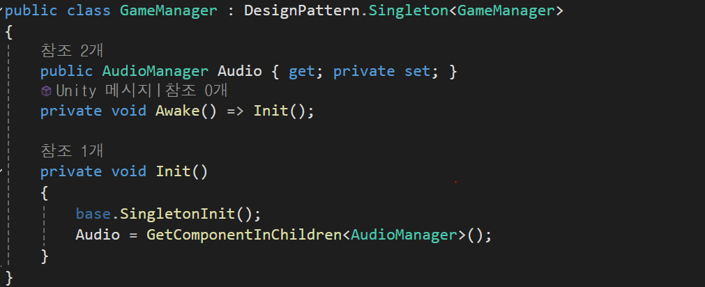싱글톤을 상속받아 Audio 자식객체인 AudioManager를 GetComponentInChildren을 통해 오브젝트를 참조한다.