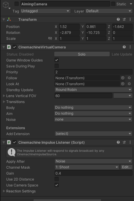 AimCamera에 impulse Listener를 넣어서 shoot이 있을경우 반동을 사용할것이다.